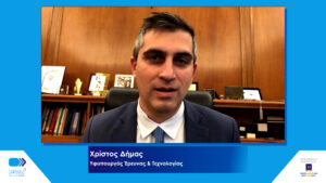 Χαιρετισμό απηύθυνε στην έναρξη της Τελετής και ο Υφυπουργός Έρευνας & Τεχνολογίας, κος. Χρίστος Δήμας, ο οποίος αρχικά συνεχάρη διοργανωτές, χορηγούς, μέντορες και ομάδες. Σημαντικό μέρος της ομιλίας του αποτέλεσε η επικείμενη συνεργασία του Ξ.Ε.Ε. και του CapsuleT ως Επίσημοι Υποστηρικτές του Elevate Greece, αλλά και η διεύρυνση της συνεργασίας του Υπουργείου Έρευνας & Τεχνολογίας με τον επιταχυντή, αφού οι νεοφυείς επιχειρήσεις του Elevate Greece που δραστηριοποιούνται στον τουρισμό αποτελούν τη 2η κατηγορία σε πλήθος, μετά τις βιοεπιστήμες.