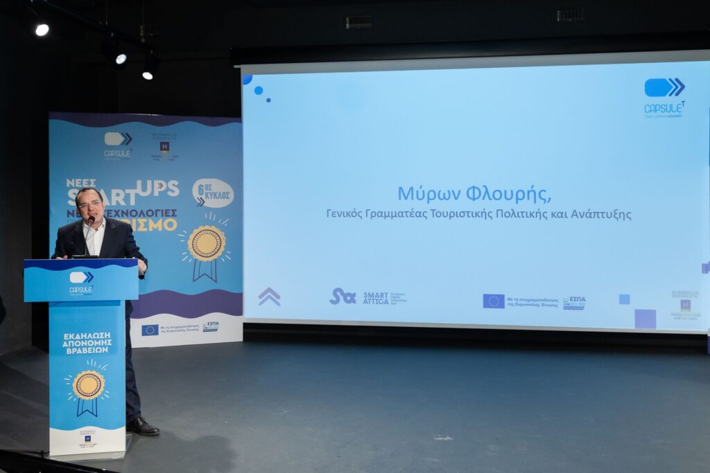 κος Μύρων Φλουρής, συνεχάρη το Ξενοδοχειακό Επιμελητήριο Ελλάδος για το έργο του CapsuleT, λέγοντας: «Σήμερα βρίσκομαι σε ένα οικείο περιβάλλον, με πρόσωπα που έχω συνεργαστεί στο παρελθόν και είμαι πολύ χαρούμενος που βλέπω νέους ανθρώπους που ασχολούνται με τις νέες τεχνολογίες και τα σύγχρονα μέσα να εστιάζουν στον Τουρισμό. Βλέπω ανθρώπους που έχουν ερευνήσει την αγορά, αντιλαμβάνονται τις τάσεις της εποχής και έχουν αποκτήσει μία ευρεία γνώση, μέσω του προγράμματος mentoring που παρείχε η CapsuleT Accelerator.